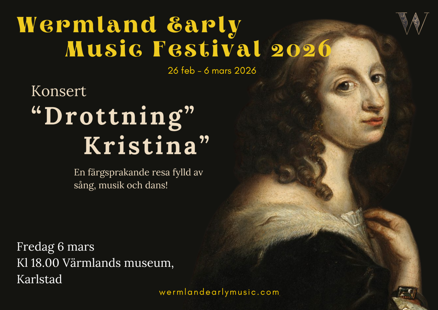 Wermland Early Music Festival bjuder på en storslagen föreställning på Värmlands Museum med musik, sång och dans till hennes ära!