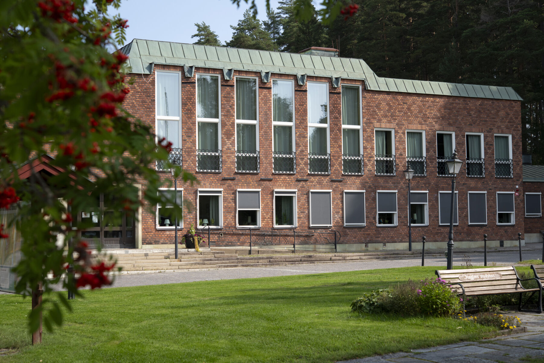 Hagfors stadshus 1952, Harry Egler Hagfors blev stad 1950 och stadshuset dess manifestation. Arkitektuppdraget gick till generalplanens författare Harry Egler. Generalplaner, det som idag kallas översiktsplaner, var hans specialitet men det blev också några hus ritade. Bäst av dem är Hagfors stadshus. Den ljusa gården och gångarna omkring den bjuder in medborgarna. Det är mer än en gest. Rummet är en resurs i det ständiga arbetet att bygga demokratin. Detta motiverade påkostade material och omsorgsfullt hantverk. Hagfors finaste hus visar att lyx skall vara en gemensam tillgång. Eglers stadshus har haft en längre hållbarhet än hans generalplan vars bärande delar försvann då tingshuset hamnade i Sunne och järnvägen revs upp. Men stadshuset och förvaltningsbyggnaderna intill visar på hur en ambitiös arkitektur kan ge avkastning på nedlagt kapital bortom avskrivningstiden.